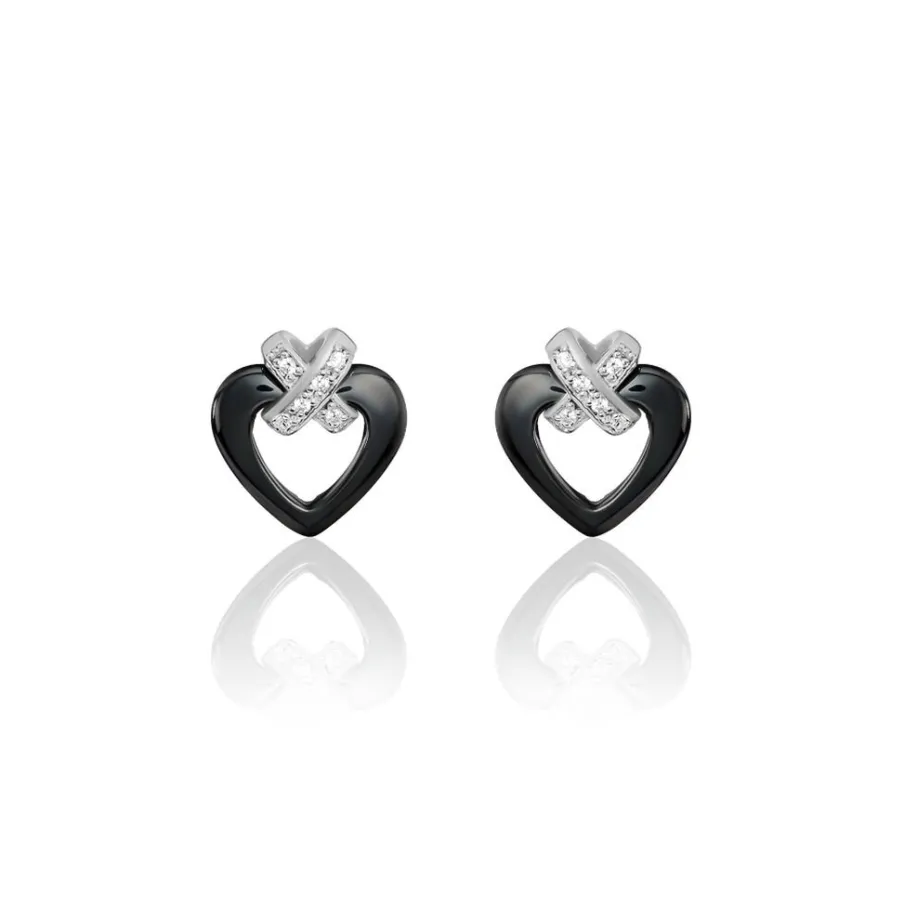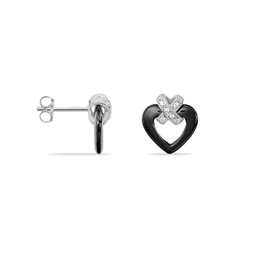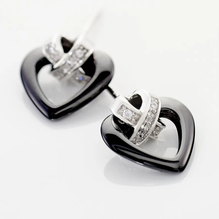 Boucles D’oreilles Argent Blanc 925/1000 Ceramiques Noires Forme Coeurs Croix Pavees Oxydes De Zirconium