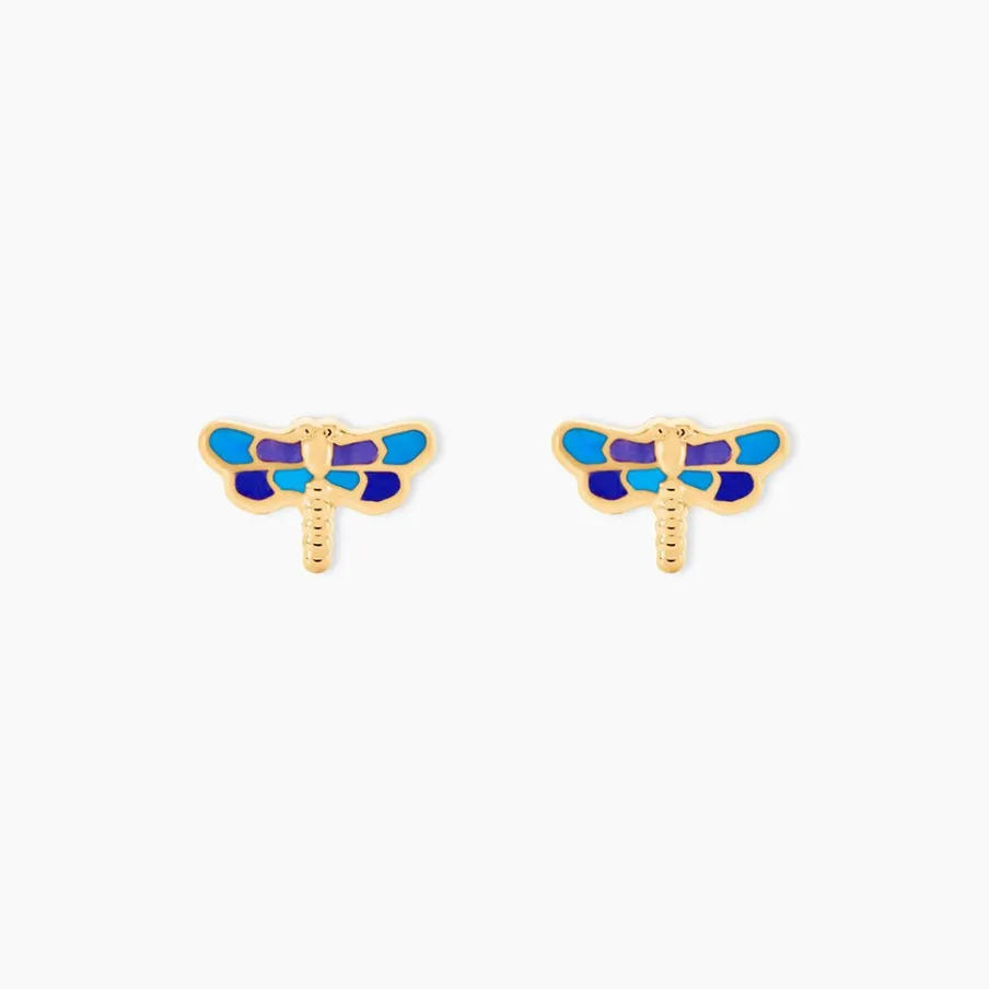 Boucles D’oreilles Puces Or Jaune 750/1000 Libellules Email Multicolore Fermoir A Vis