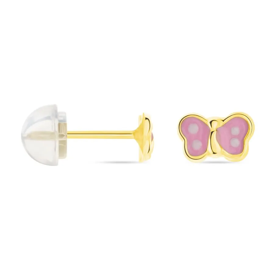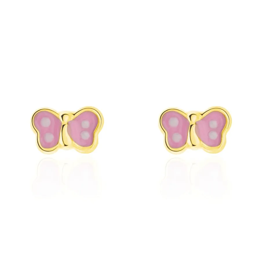 Boucles D’oreilles Or Jaune 375/1000 Papillon Email Rose