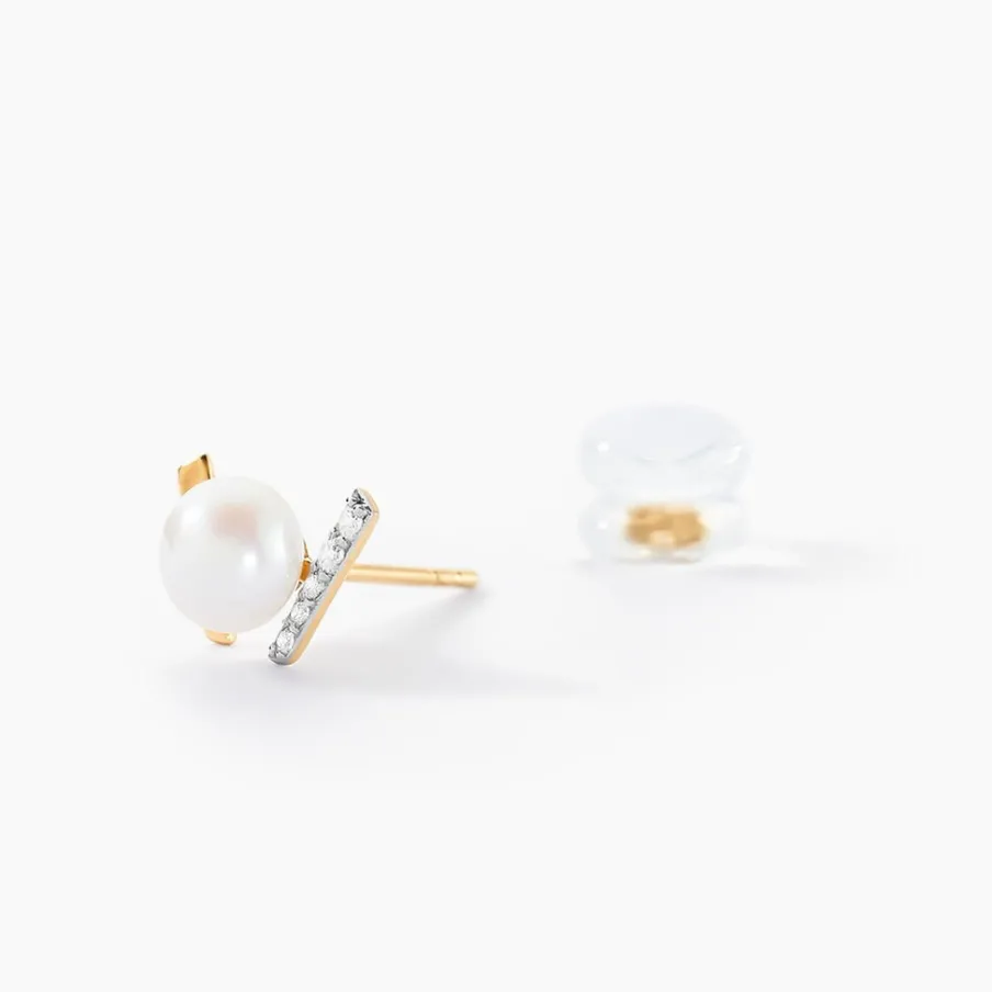 Boucles D’oreilles Puces Or Jaune 375/1000 Perle De Culture Blanche Et Barre Pavage Oxydes De Zirconium