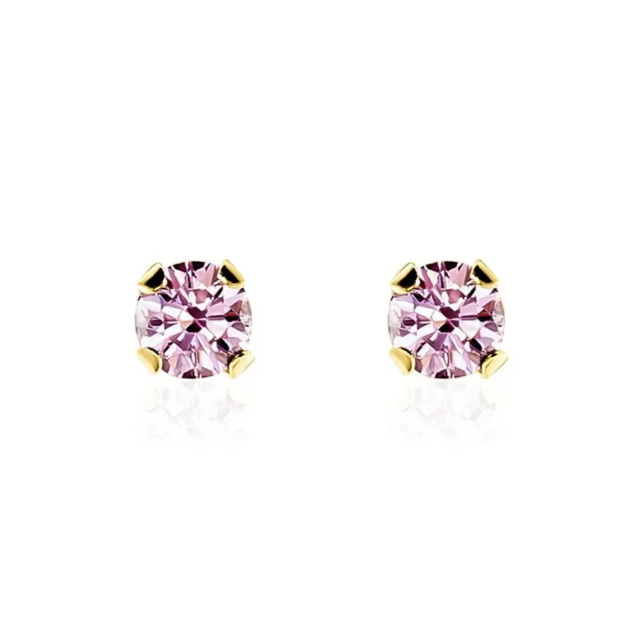 Boucles D’oreilles Puces Or Jaune 750/1000 Oxydes De Zirconium Roses Forme Ronde Serti 4 Griffes 3mm Fermoirs Vis