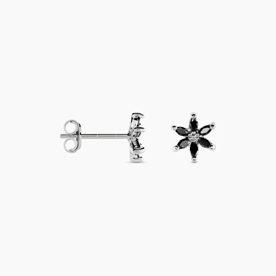 Boucles D’oreilles Puces Argent Blanc 925/1000 Fleurs Oxydes De Zirconium Noirs
