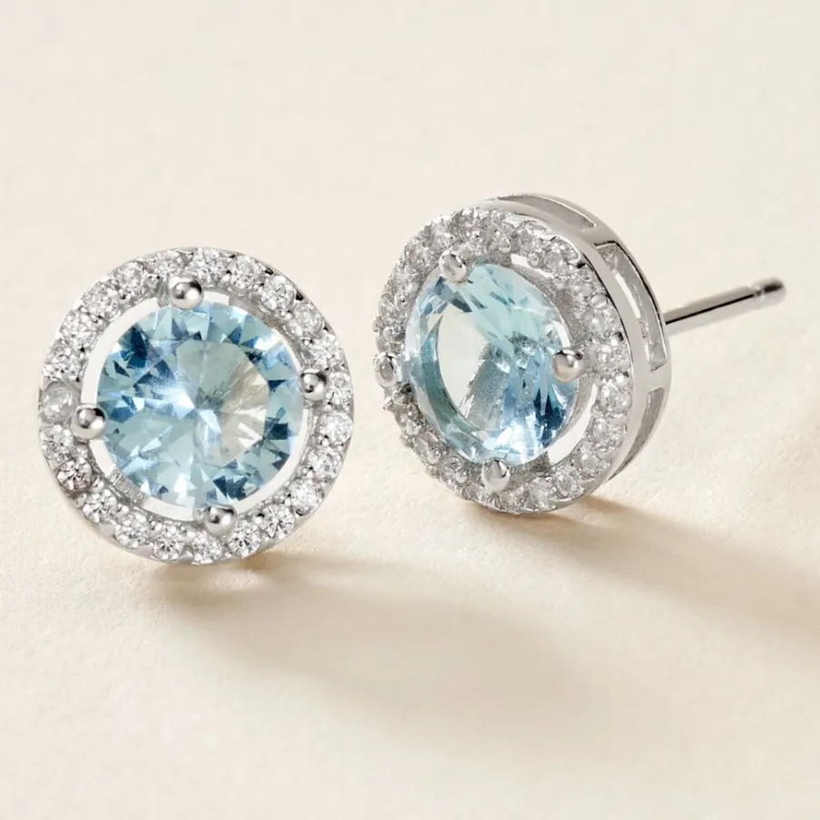 Boucles D’oreilles Puces Argent Blanc 925/1000 Oxydes De Zirconium Bleu Azur Entourage Oxydes Sertis Griffes