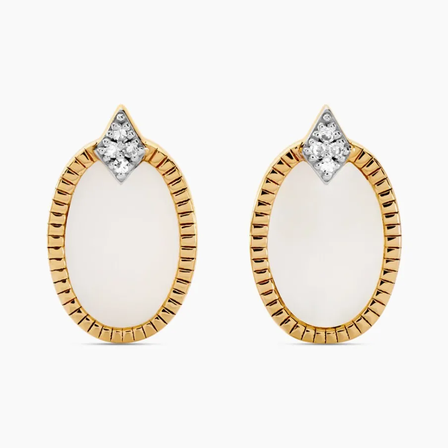 Boucles D’oreilles Puces Or Jaune 375/1000 Nacres Blanches Ovales Et Losanges Pavage Diamants