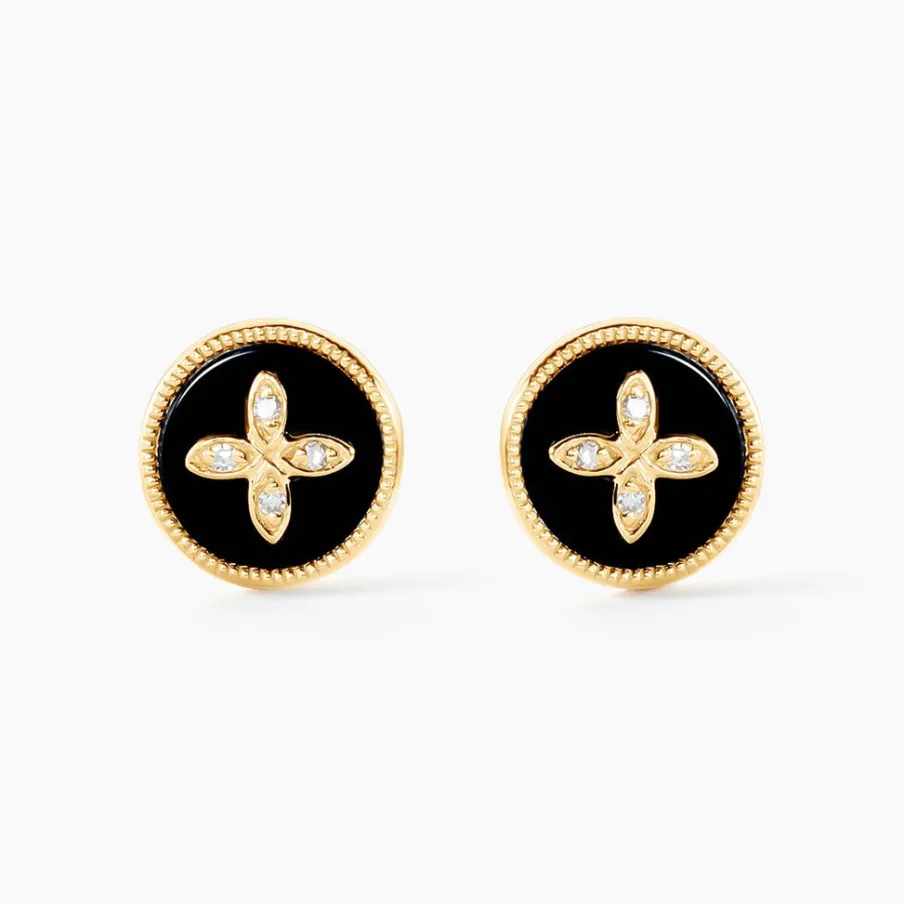 Boucles D’oreilles Puces Or Jaune 375/1000 Agates Noires Et Motifs Fleurs Diamants