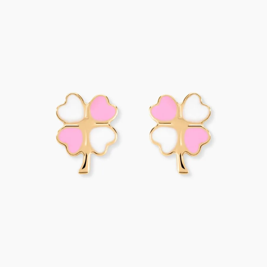 Boucles D’oreilles Or Jaune 375/1000 Trèfle Email Rose Et Blanc