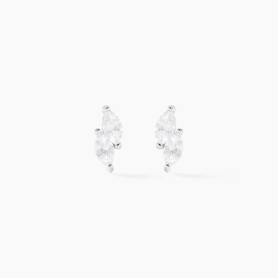 Boucles D’oreilles Puces Argent Blanc 925/1000 Oxydes De Zirconium Taille Navette Serti Griffes