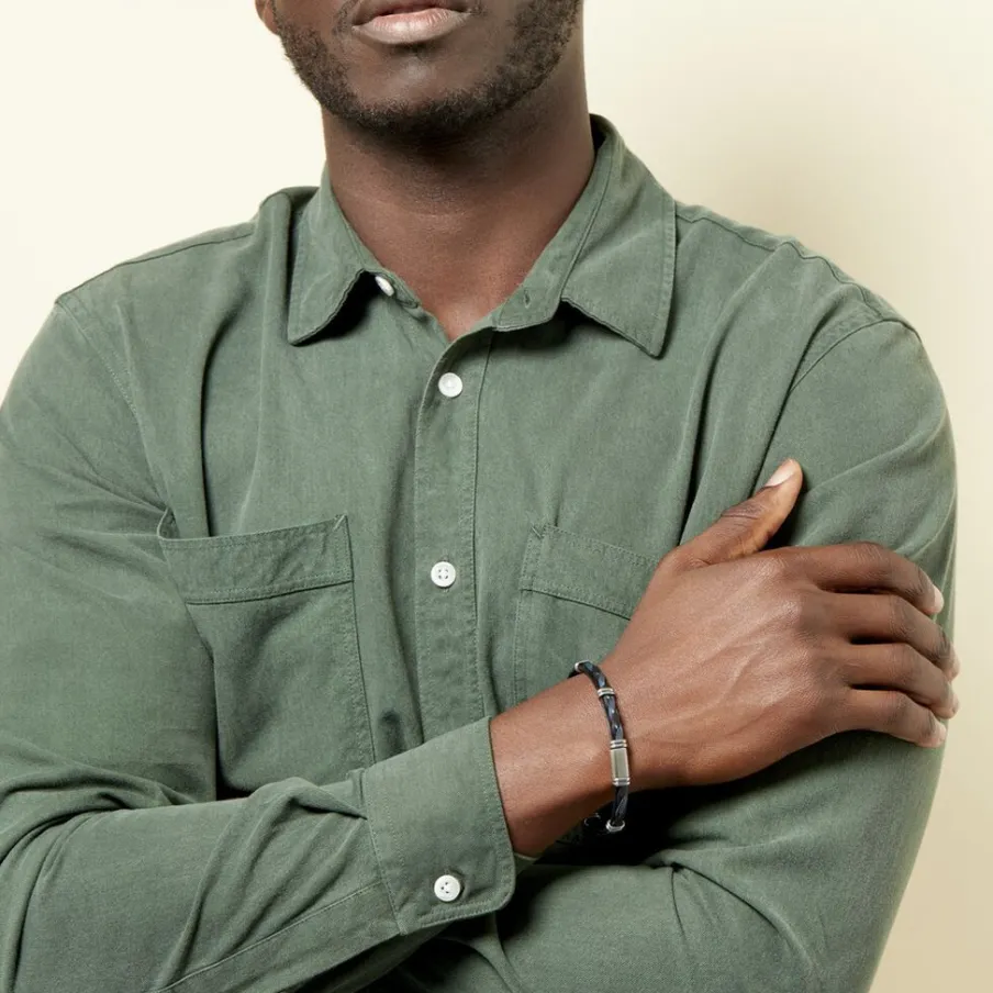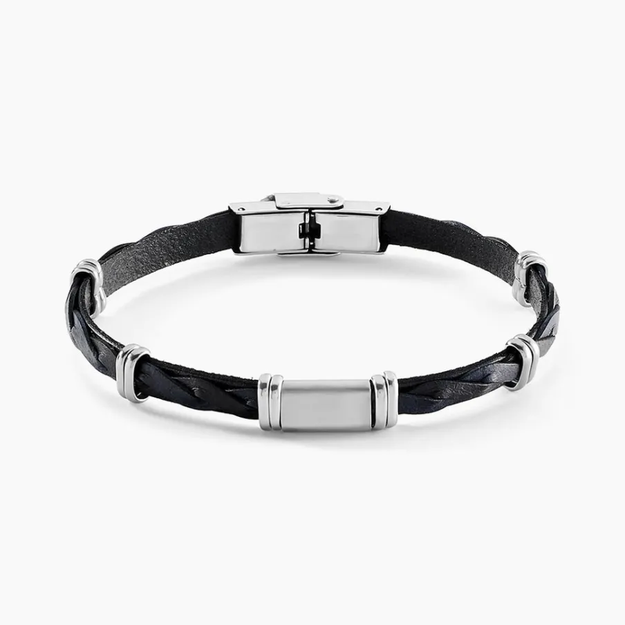 Bracelet Acier Inoxydable Blanc Cuir De Vache Noir Et Bleu Tressé 21cm