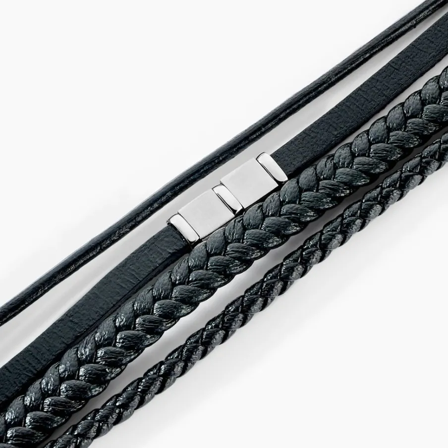 Bracelet Acier Inoxydable Blanc Multi Bracelets Tressé Cuir De Vache Noir Et Synthetique Noir 21cm