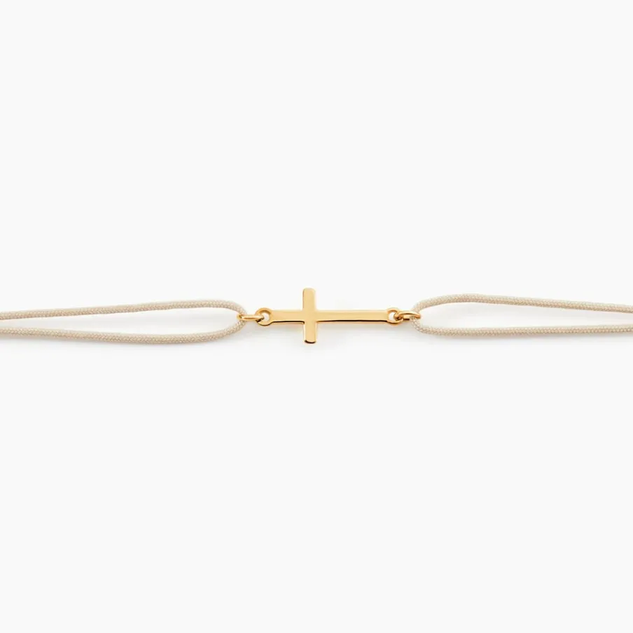 Bracelet Or Jaune 375/1000 Croix Sur Cordon Nylon Ajustable Beige