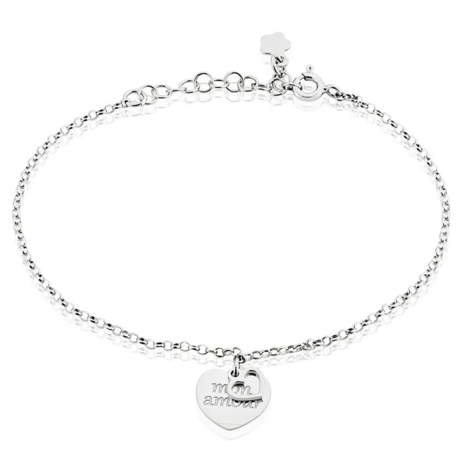 Bracelet Argent Blanc 925/1000 Double C艙urs Message Mon Amour Maille Jaseron 19cm