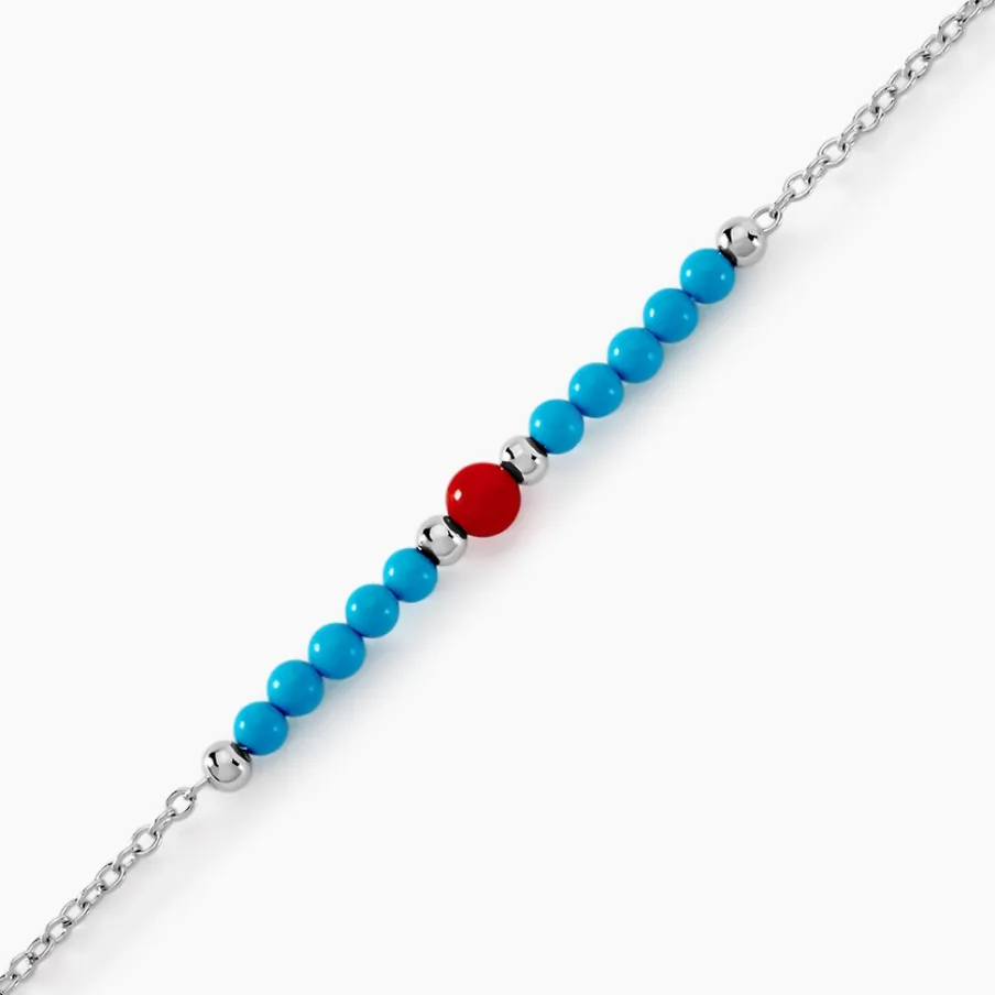 Bracelet Argent Blanc 925/1000 1 Boule Corail Rouge Et Boules Turquoises Maille Jaseron 17+3cm