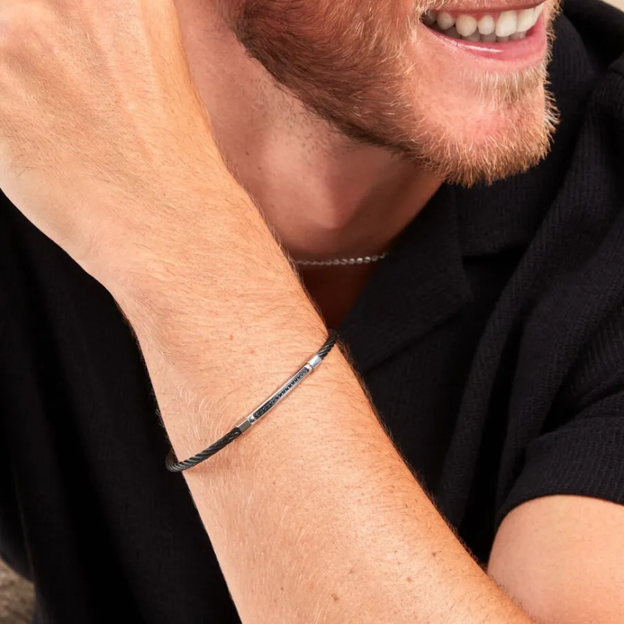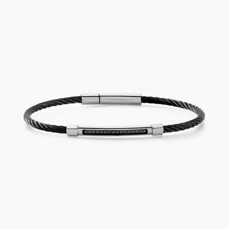 Bracelet Acier Inoxydable Blanc Câble Noir Pavage Oxydes De Zirconium Noirs Largeur 3mm 18.5cm
