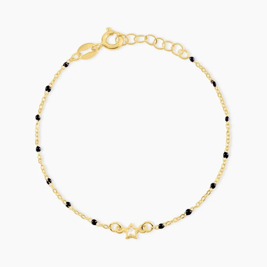 Bracelet Court Argent Jaune 925/1000 Étoile Oxyde De Zirconium Serti Clos Boules Email Noir Maille Forcat 14+2Cm