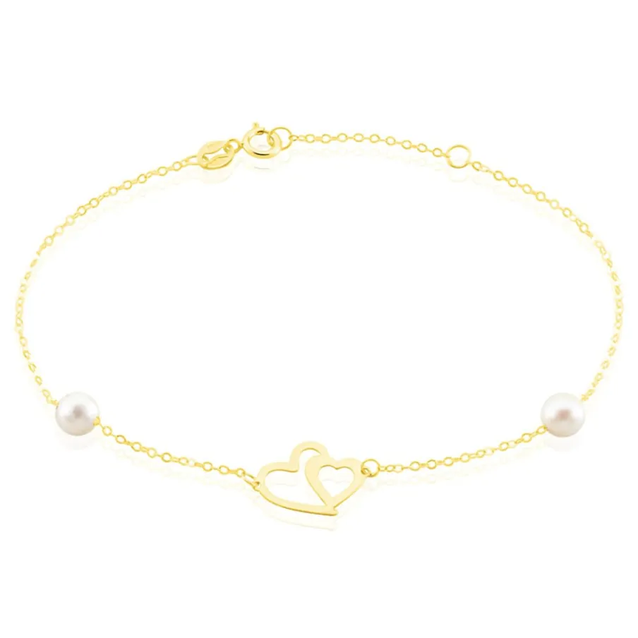 Bracelet Or Jaune 375/1000 Chaine Forçat Double C艙ur Perles De Culture 4.5/5mm 16+2cm