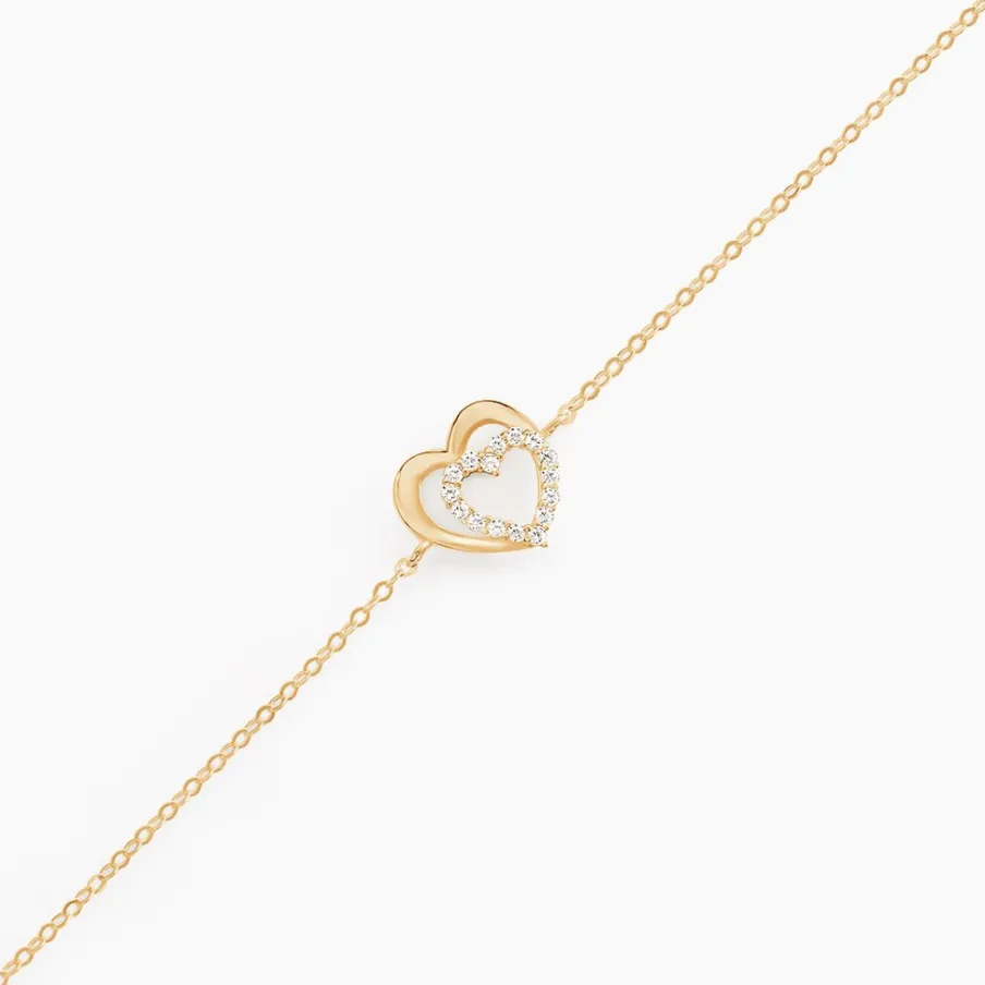 Bracelet Or Jaune 375/1000 Double C艙urs Pavage Oxydes De Zirconium 18cm