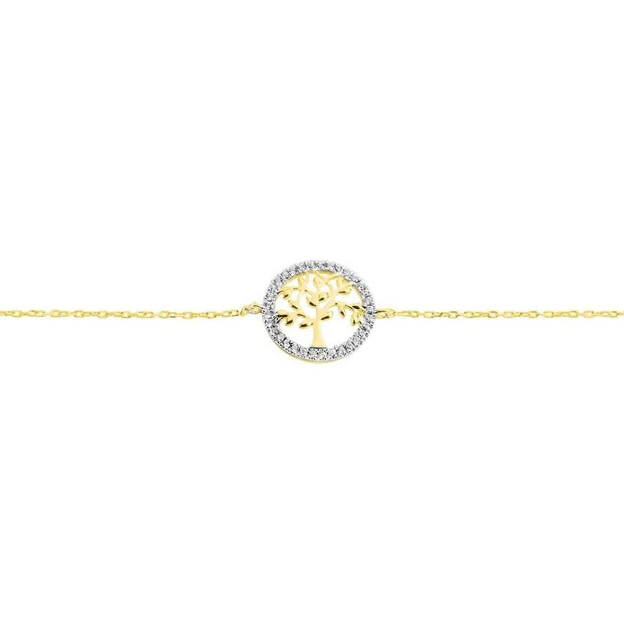 Bracelet Or Jaune 375/1000 Arbre De Vie Micro Pavage Oxydes De Zirconium Maille Forçat 16+2cm