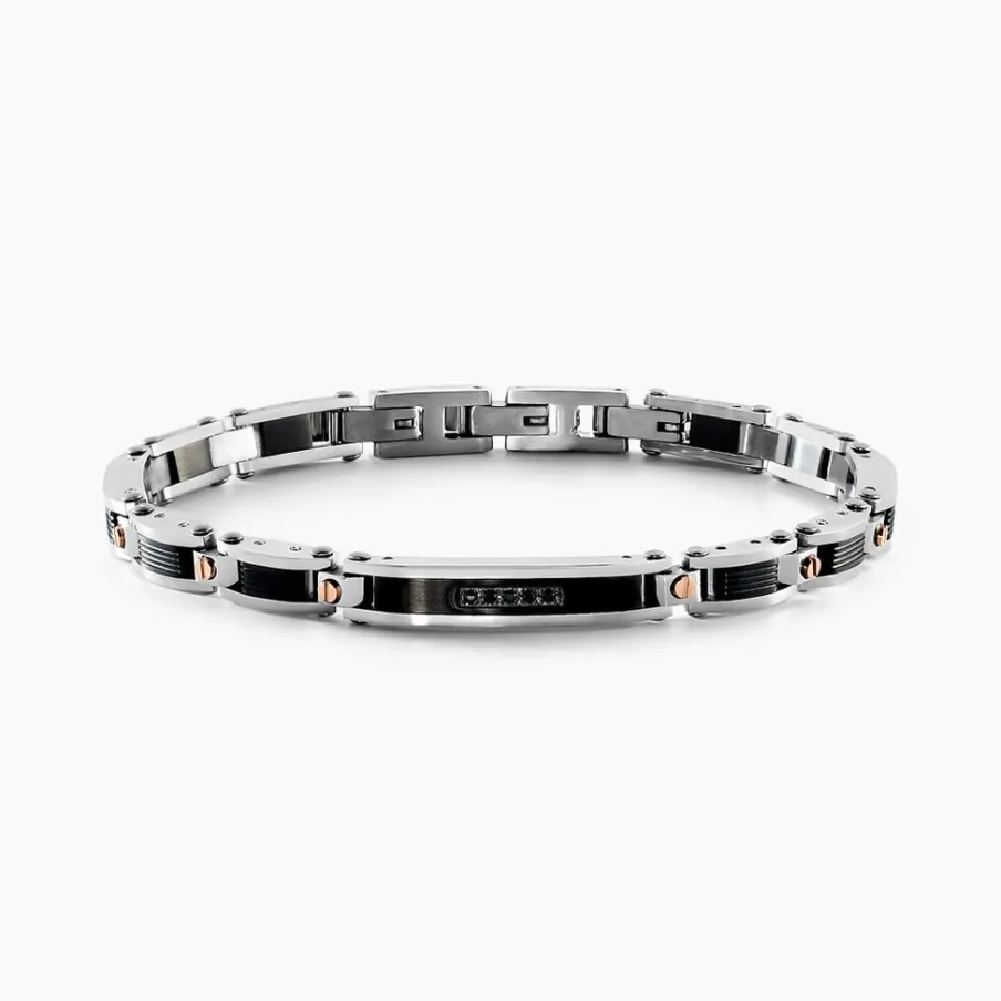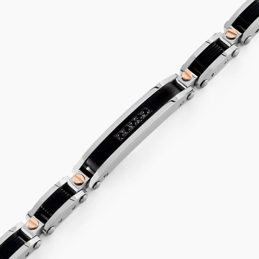 Bracelet Acier Inoxydable Tricolore Maillons Rigides Oxydes De Zirconium Noirs Largeur 5.5mm 19+2cm