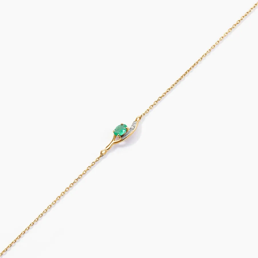 Bracelet Or Jaune 375/1000 Emeraude Ovale 0.12cts Et Diamant Sertis Griffes Maille Forcat 16+2cm