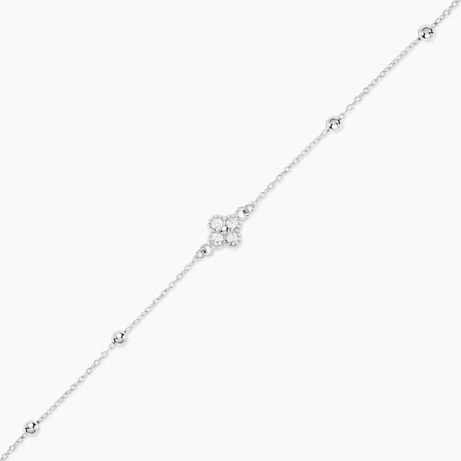 Bracelet Court Argent Blanc 925/1000 Fleur Oxydes De Zirconium Et Boules Maille Forcat 14+2Cm