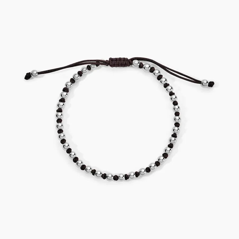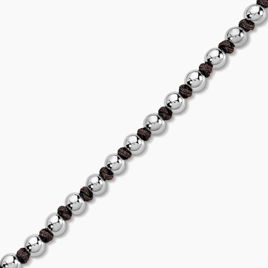 Bracelet Acier Inoxydable Blanc Boules Et Cordon Nylon Marron Foncé 18-27Cm