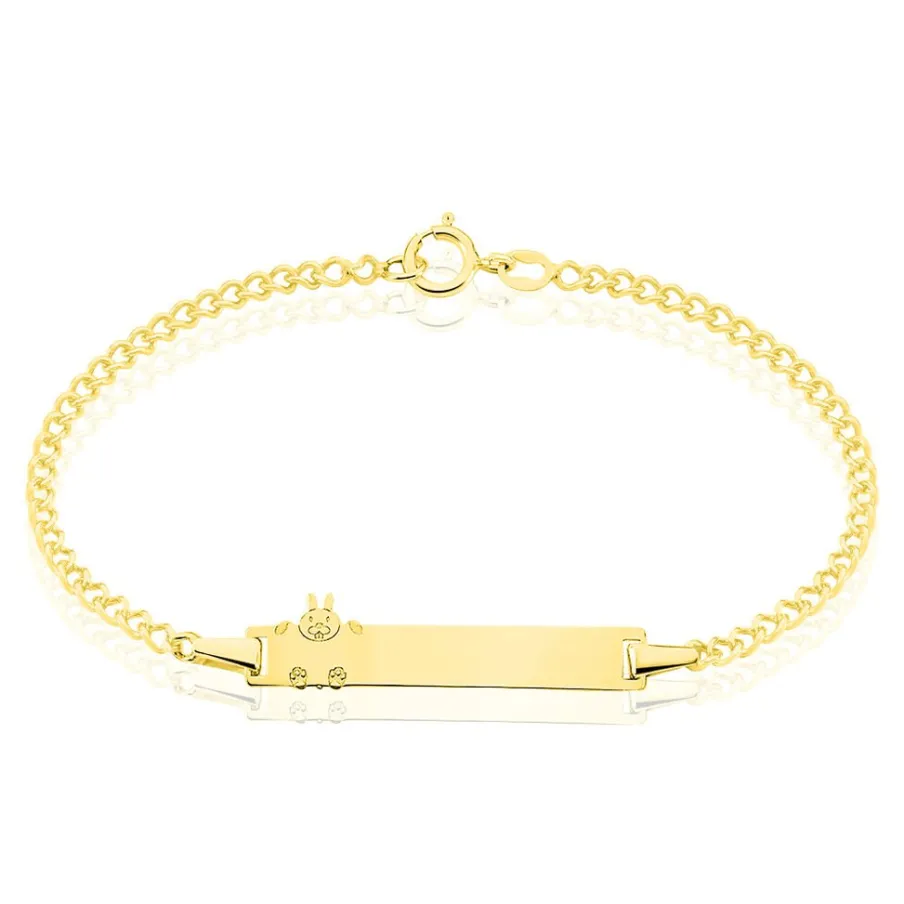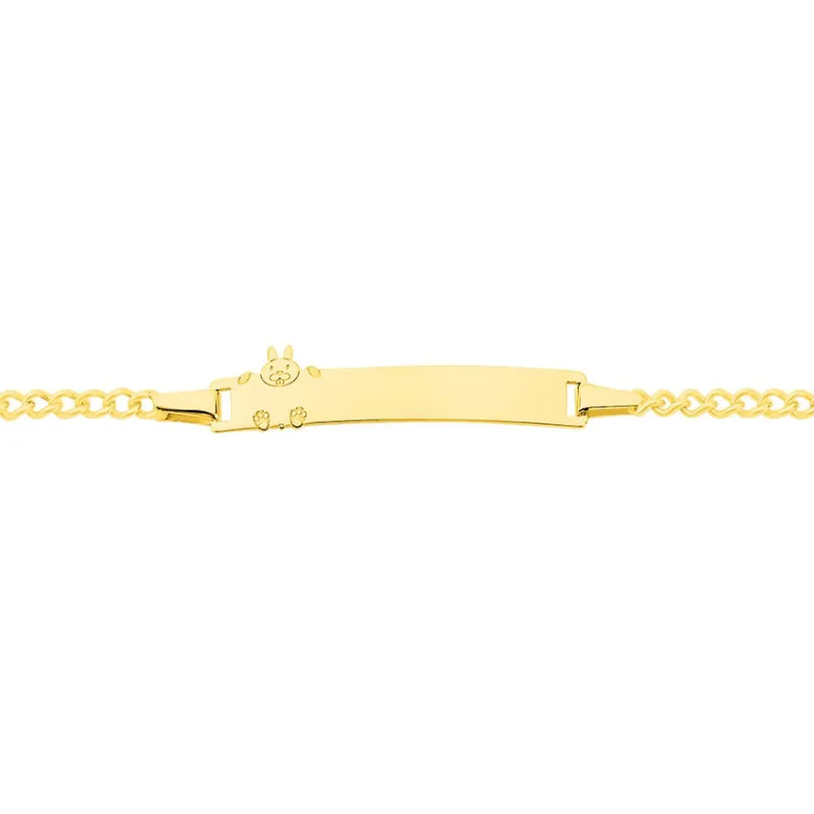 Bracelet Identite Bebe Or Jaune 375/1000 Plaque Rectangle Motif Lapin Maille Gourmette 12/14cm