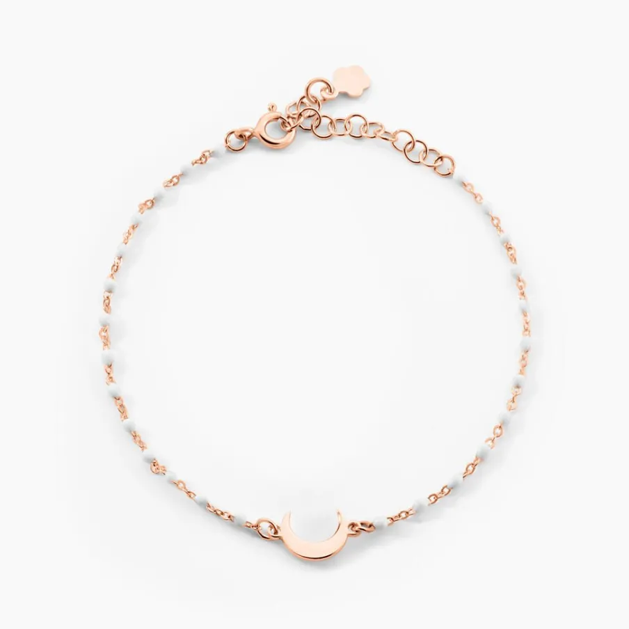 Bracelet Court Argent Rose 925/1000 Lune Boules émail Blanc Maille Boules 13+3cm