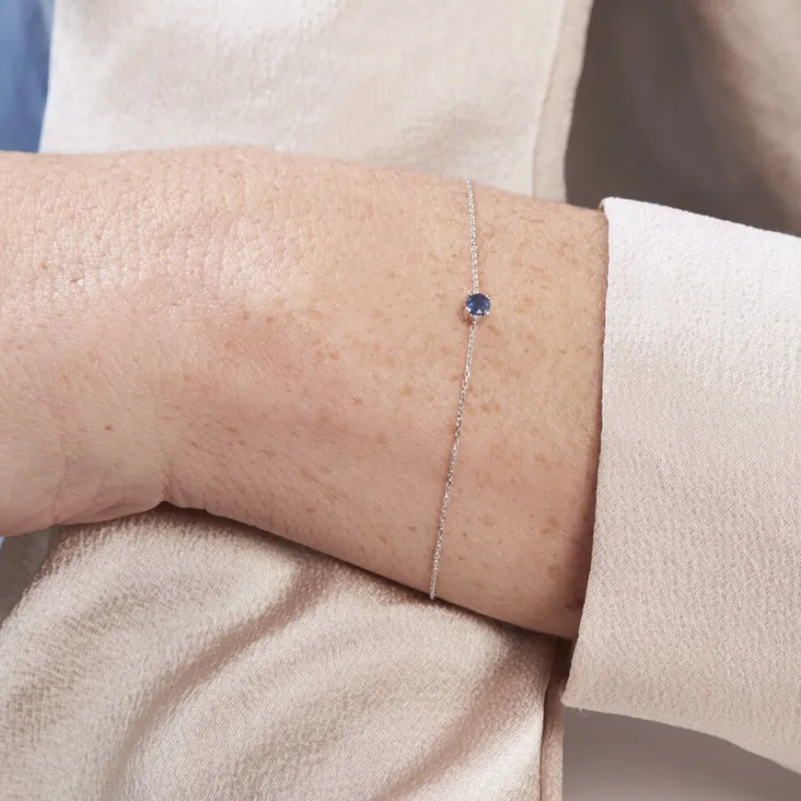 Bracelet Solitaire Or Blanc 375/1000 Saphir Serti Griffes 0.12ct Maille Forçat 18cm