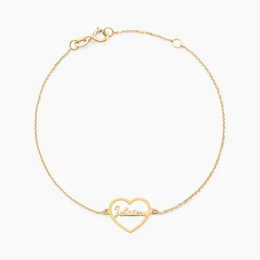 Bracelet Or Jaune 375/1000 C艙ur Ajoure Avec Message Je T’aime Maille Jaseron 18cm