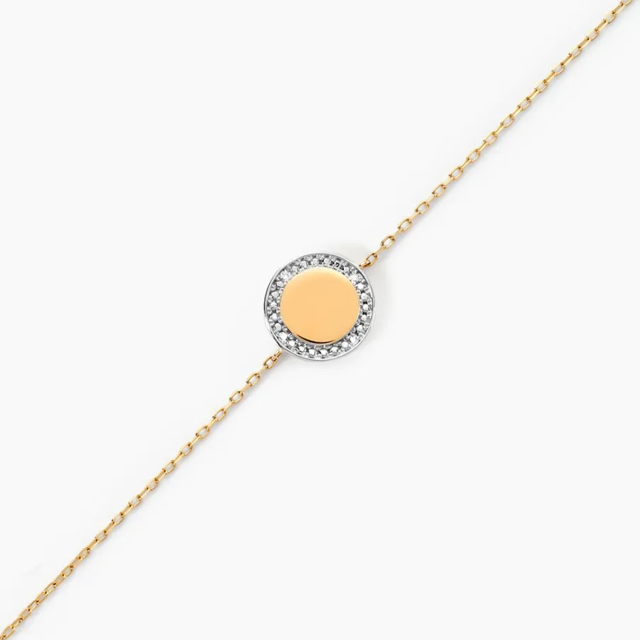 Bracelet Or Jaune 375/1000 Rond Gravable Diamants 0.009cts Illusion Maille Forcat 16+2cm