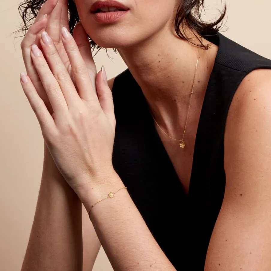 Bracelet Or Jaune 375/1000 Fleur Oxyde De Zirconium Serti Griffes Et 2 Petites Boules Maille Jaseron 16+2cm