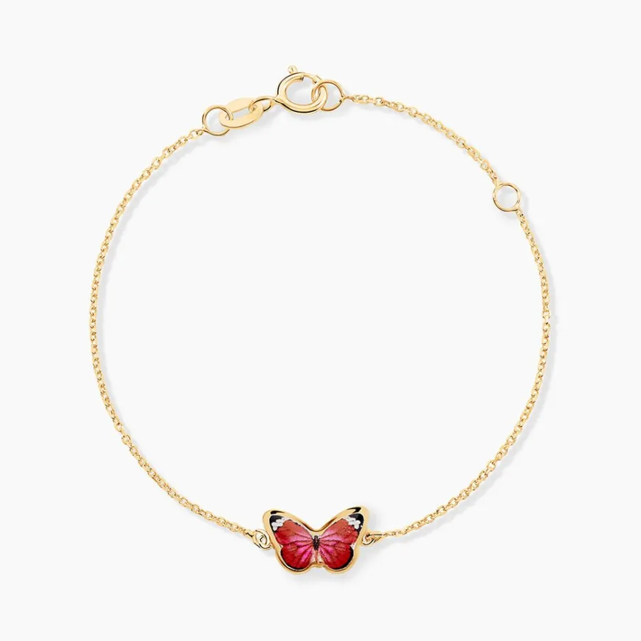 Bracelet Or Jaune 375/1000 Papillon Smalto Fushia Maille Jaseron 14cm