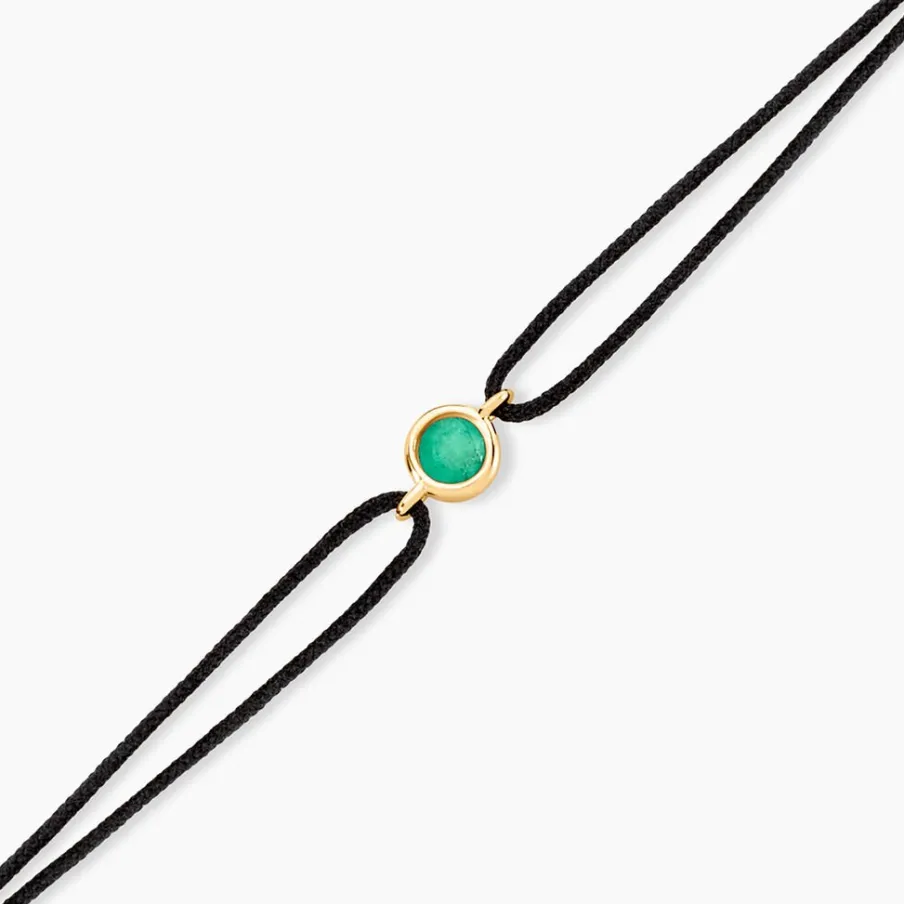 Bracelet Or Jaune 375/1000 Emeraude Ronde 0,11Cts Serti Clos Cordon Nylon Noir Ajustable