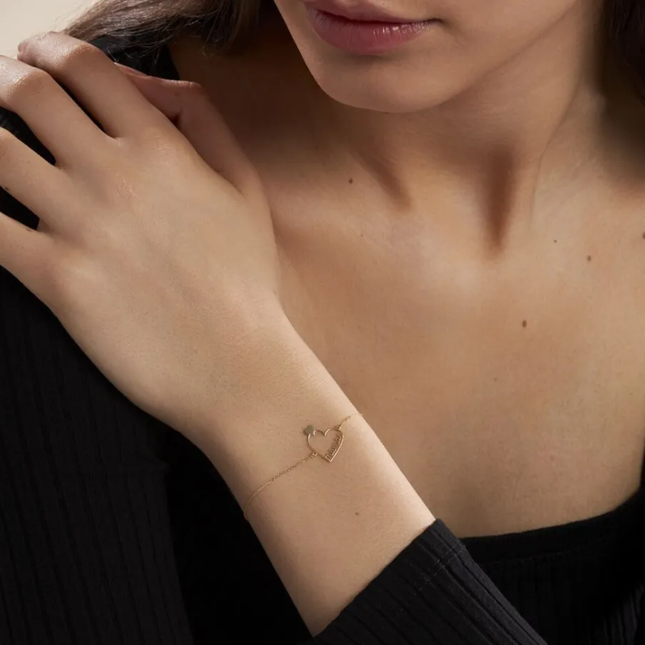 Bracelet Or Jaune 375/1000 Coeur Penche Ajoure + Petit C艙ur Plein Message Maman Maille Jaseron 18cm