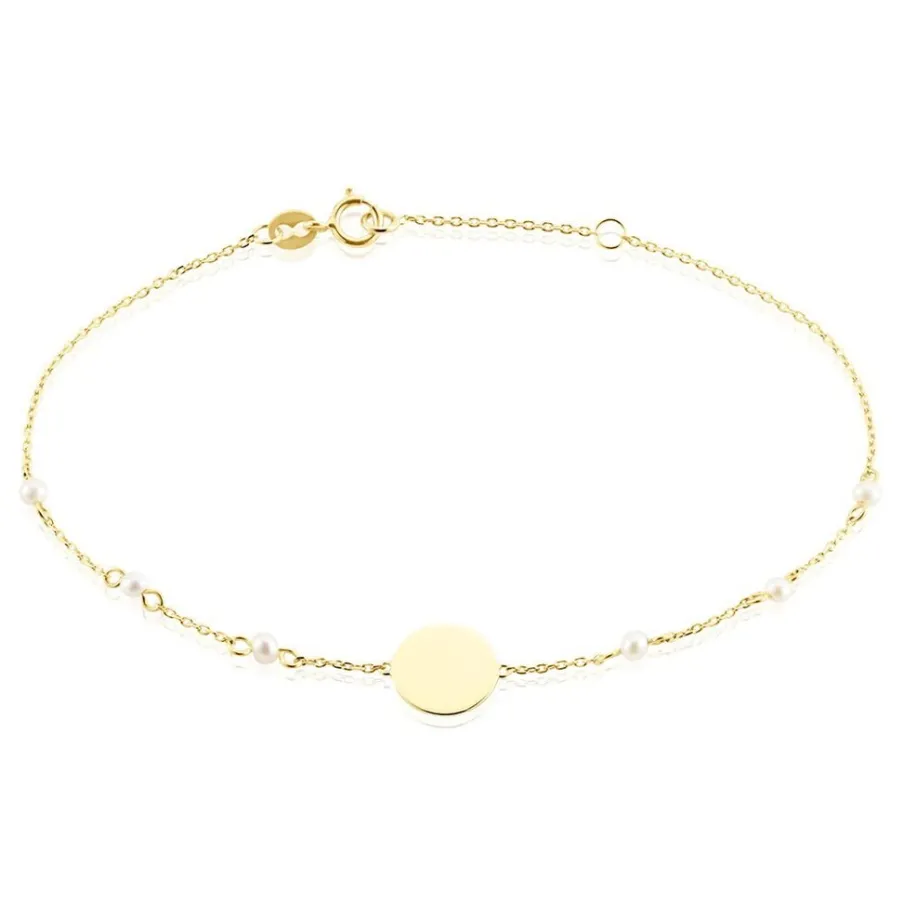 Bracelet Or Jaune 375/1000 6 Perles De Culture Rondes Blanches 2mm Collees Maille Forcat 16+2cm