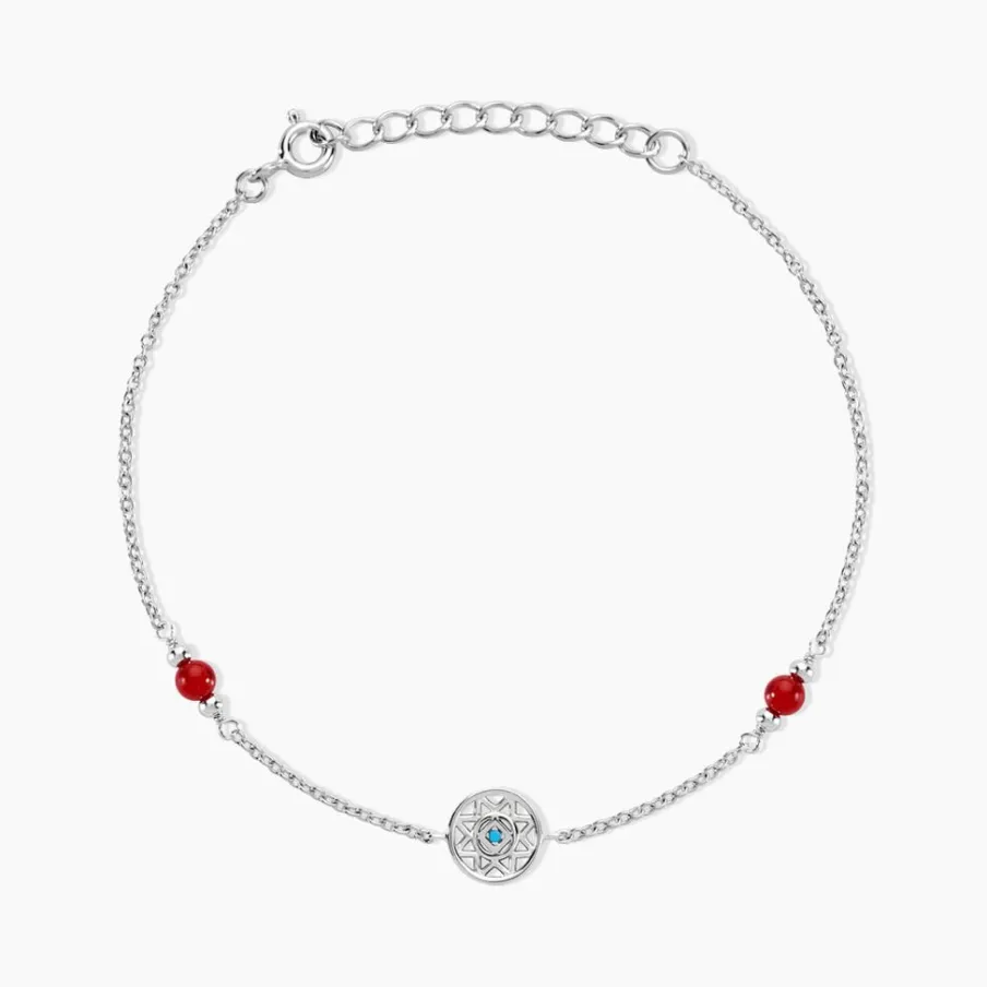 Bracelet Argent Blanc 925/1000 Pastille Ajourée Motif Rosace Et Boules Corail Rouge Maille Jaseron 17+3cm