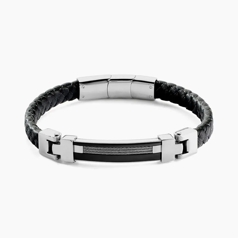 Bracelet Acier Inoxydable Blanc Cuir De Vache Noir Tressé Plaque Acier Inoxydable Ip Noir Et Cables 21cm
