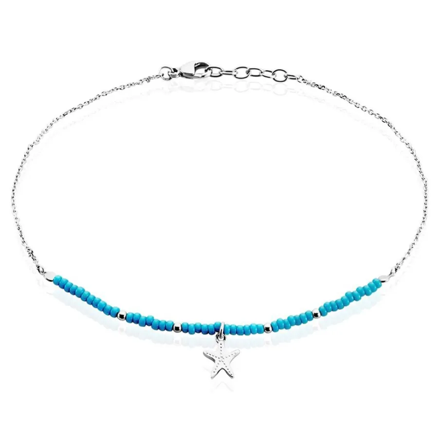 Chaîne De Cheville Argent Blanc 925/1000 Pampille Etoile De Mer Perles De Miyuki Bleues Et Boules Argent Maille Forçat 25cm