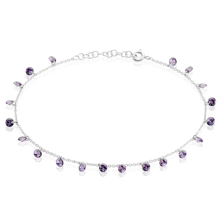 Chaîne De Cheville Argent Blanc 925/1000 Pampilles Oxydes De Zirconium Violets Maille Forçat 25cm