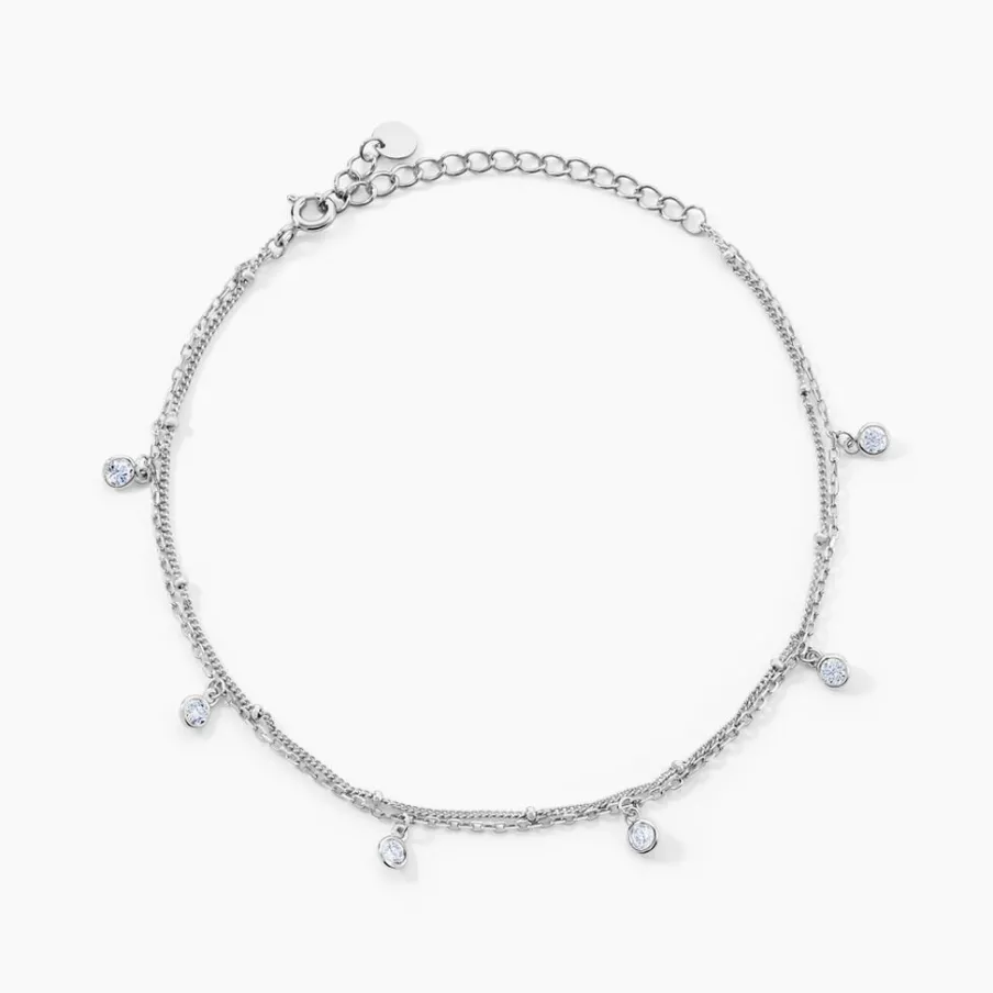 Chaîne De Cheville Argent Blanc 925/1000 Oxydes De Zirconium Lavande Double Rang Maille Forçat Et Boules 23+3cm