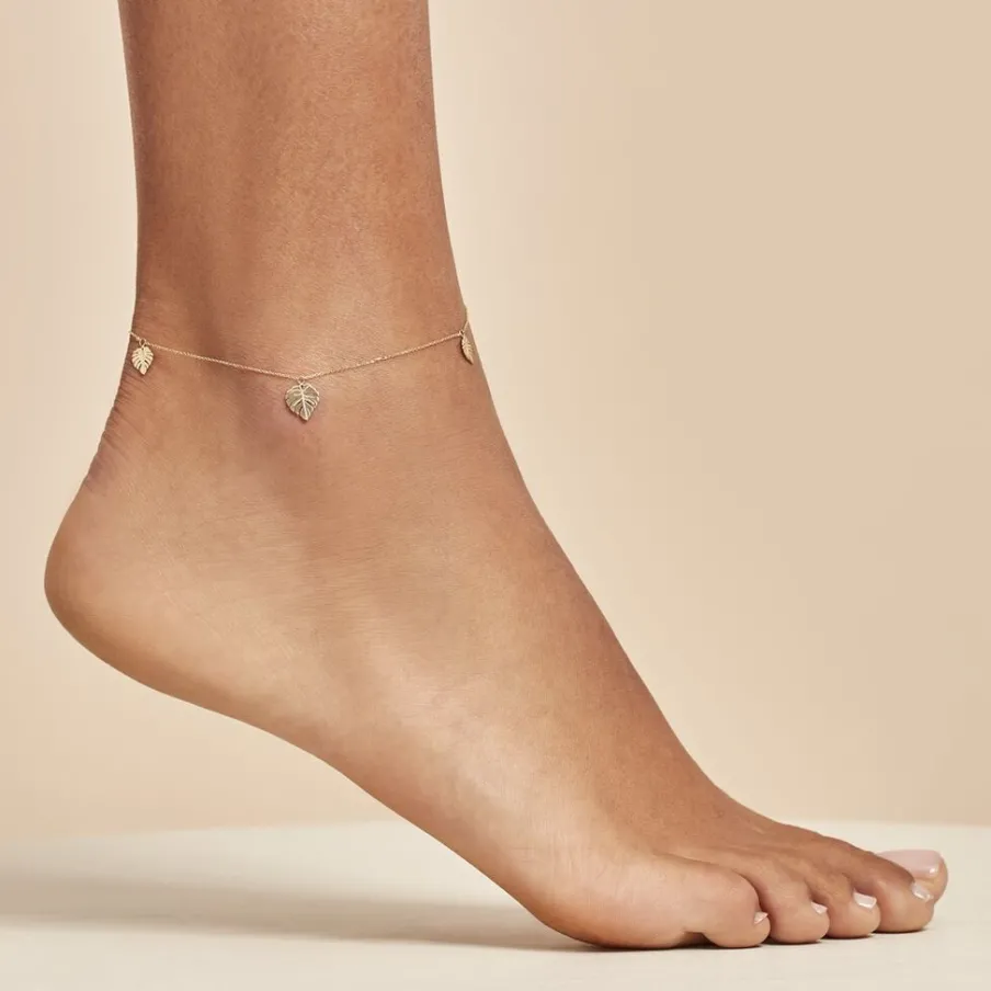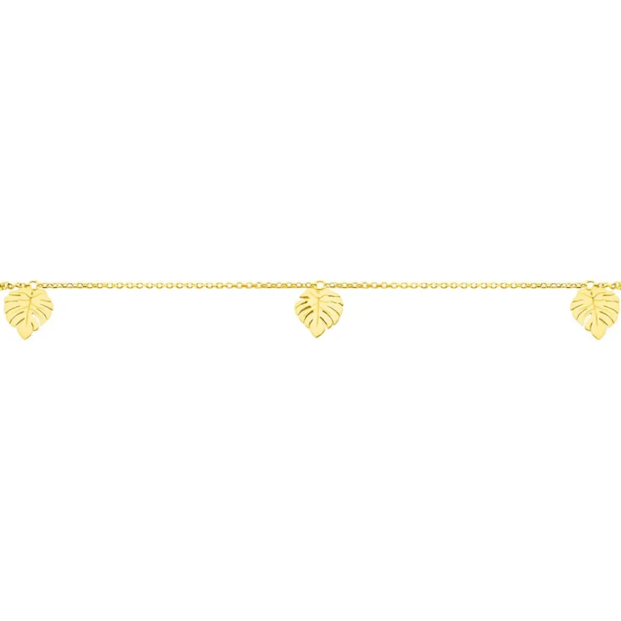 Chaine De Cheville Or Jaune 375/1000 Pampilles Motifs Feuilles Tropicales Maille Jaseron 24cm