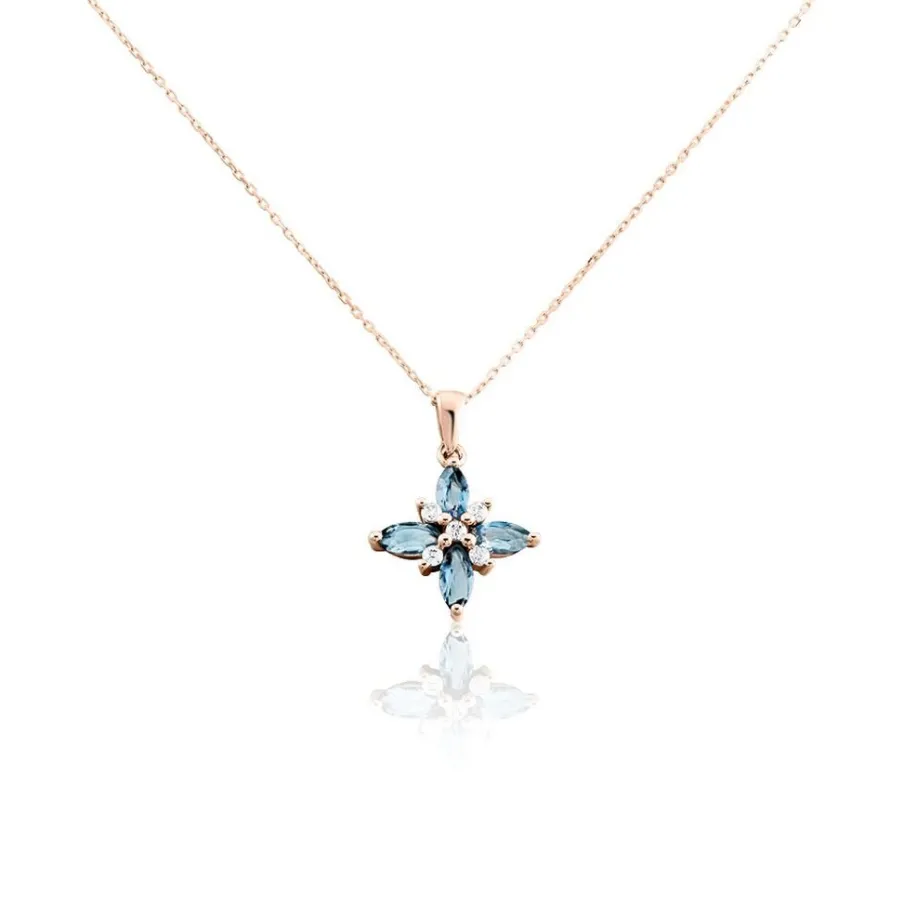 Collier Or Rose 375/1000 Motif Fleur Maille Forçat Topaze Bleu London Sertis Griffes Oxydes De Zirconium Blanc 42cm