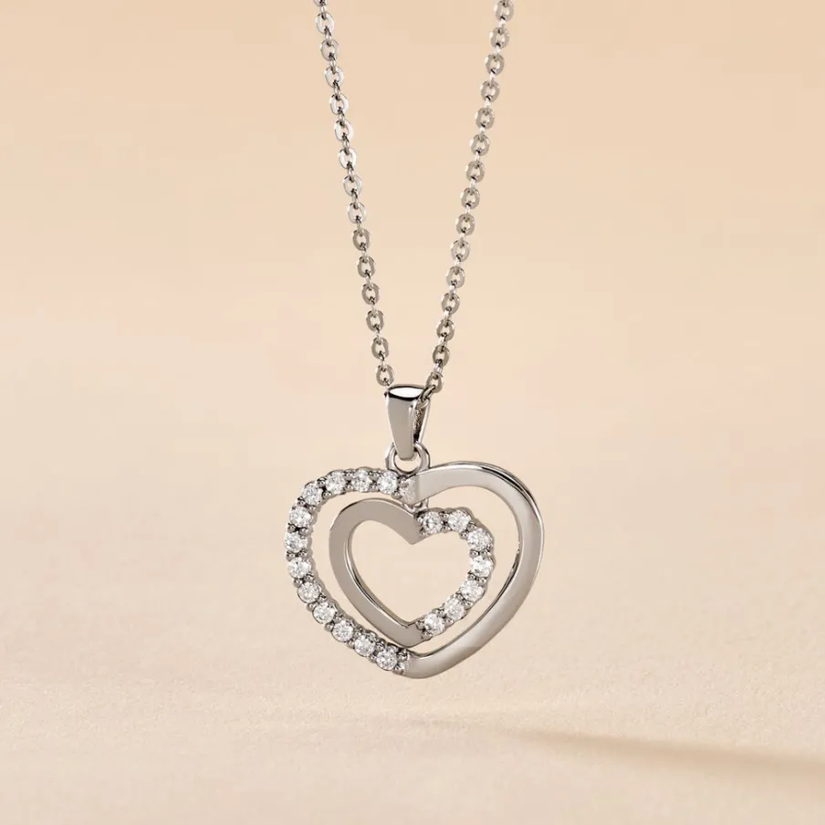 Collier Argent 925/1000 annabelle Pendentif Fantaisie 2 Coeurs Avec Oxydes De Zirconium Maille Forcat 42cm