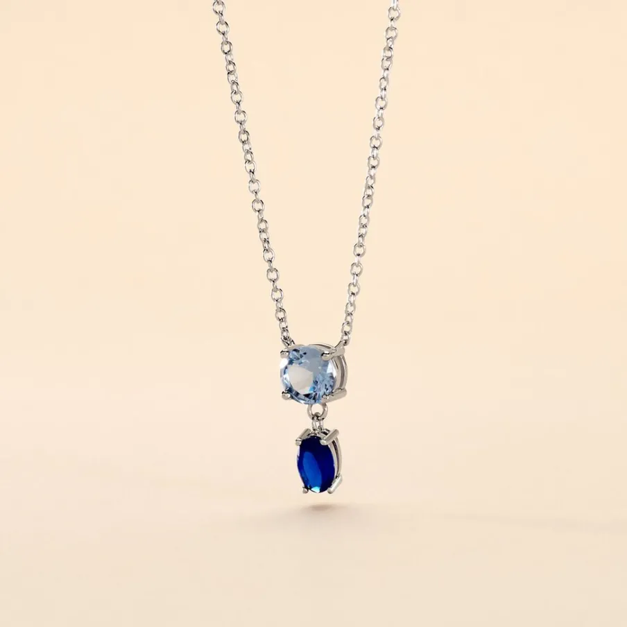 Collier Argent Blanc 925/1000 Serti Griffes Oxydes De Zirconium Bleu Clair Et Bleu Maille Forçat 45cm