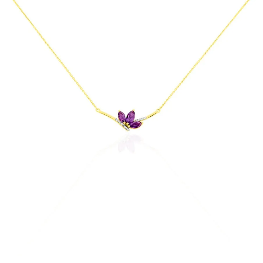 Collier Or Jaune 375/1000 Améthystes Navettes Formes Fleurs Accompagne Oxydes De Zirconium 42cm