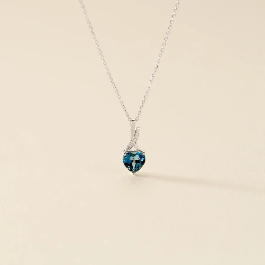 Collier Or Blanc 375/1000 Clothilde Topaze London Blue Forme C艙ur Et Oxydes De Zirconium 45cm