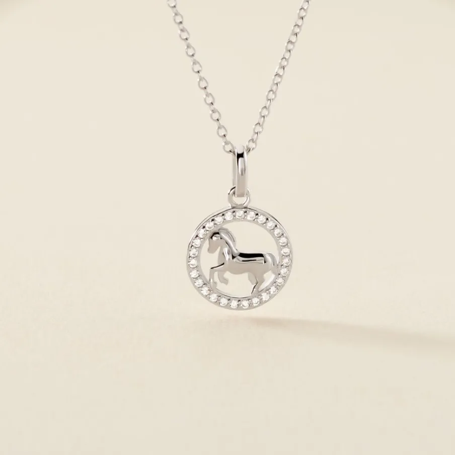 Collier Court Argent Blanc 925/1000 Motif Cheval Oxyde De Zirconium Serti Griffes Maille Forcat 38cm