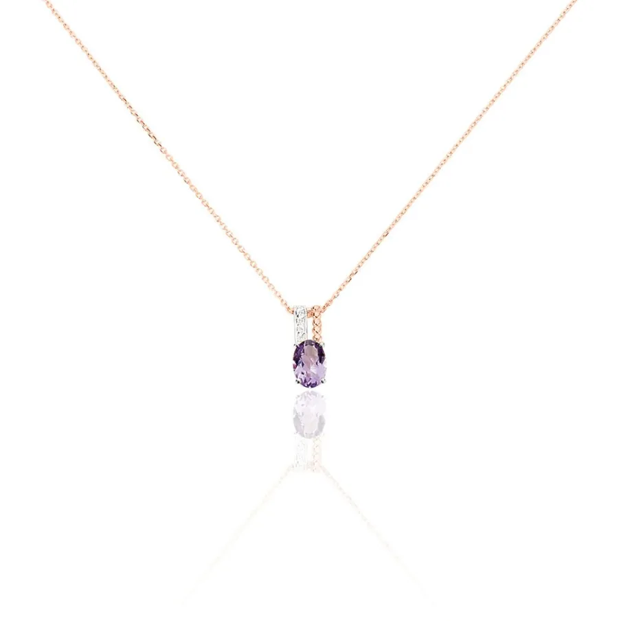 Collier Or Rose 375/1000 Améthyste Forme Ovale Ajoure Et Perle + Semi Pave Oxydes De Zirconium 42cm
