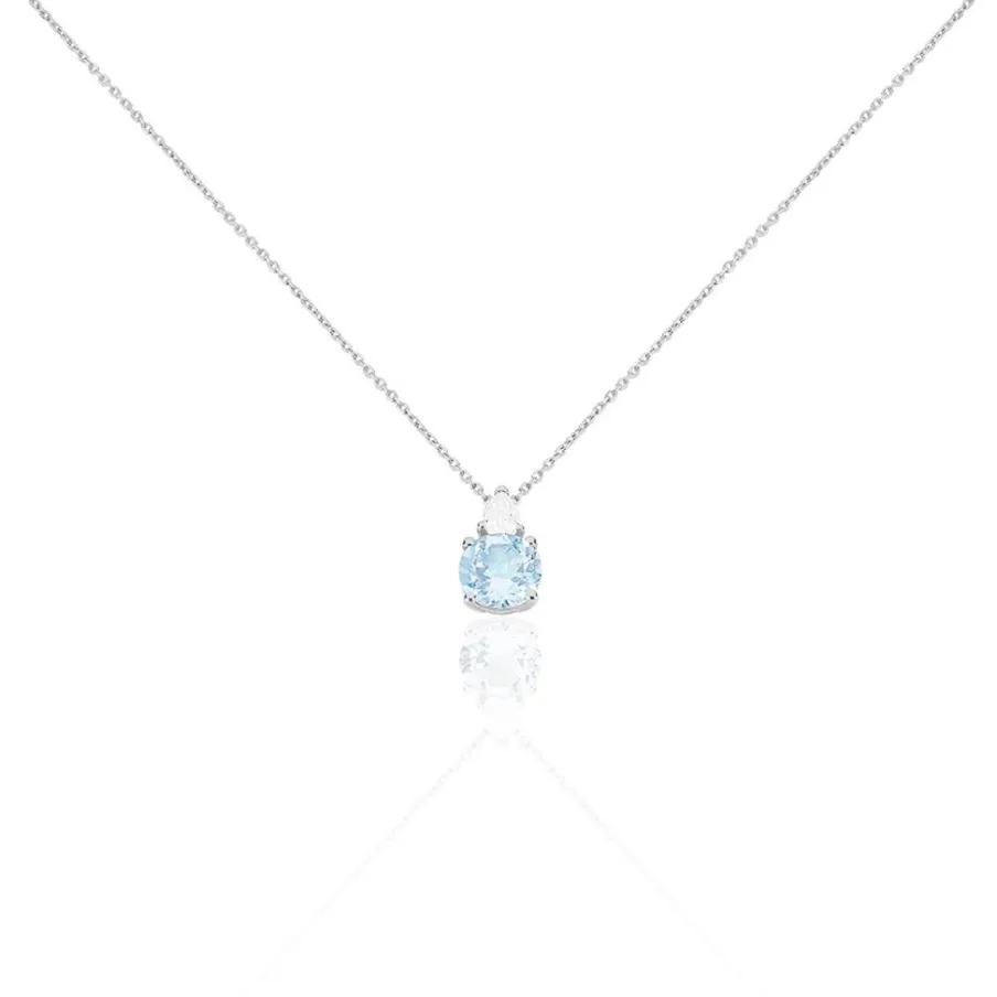 Collier Or Blanc 375/1000 Topaze Centrale Forme Ronde + Oxyde De Zirconium Taille Poire 43cm