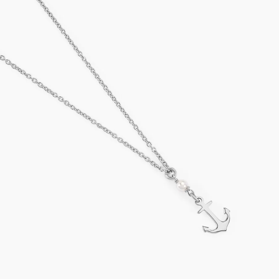 Collier Argent Blanc 925/1000 Ancre Marine Et Perle D’imitation Maille Forcat 45cm